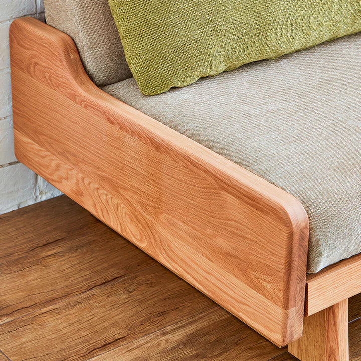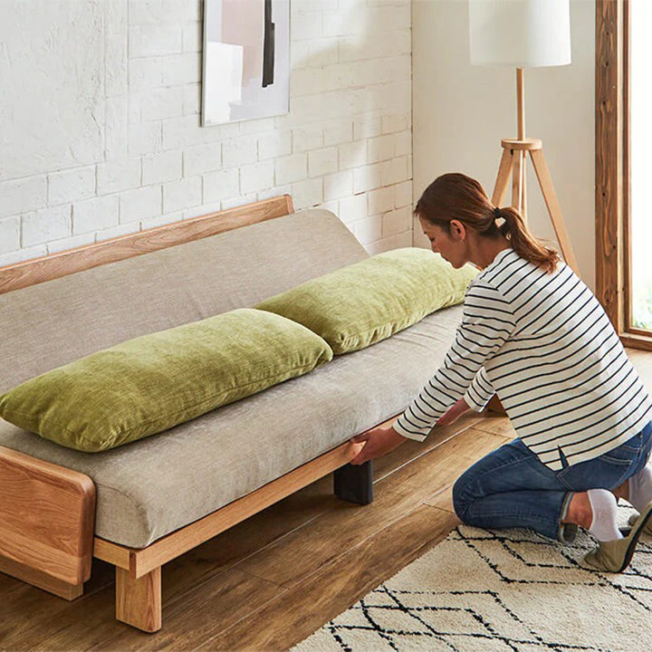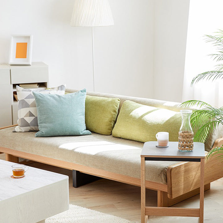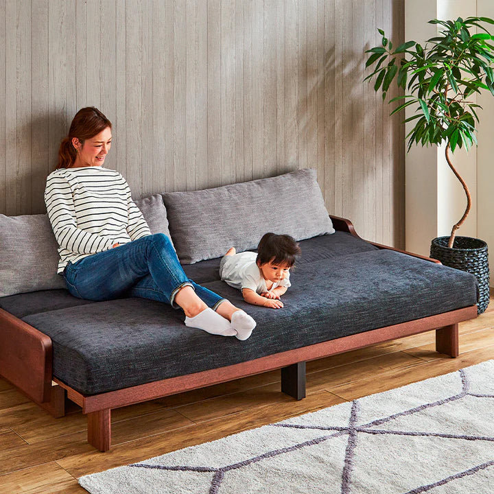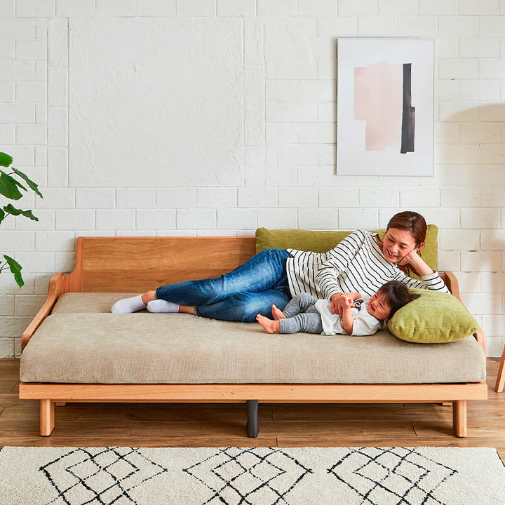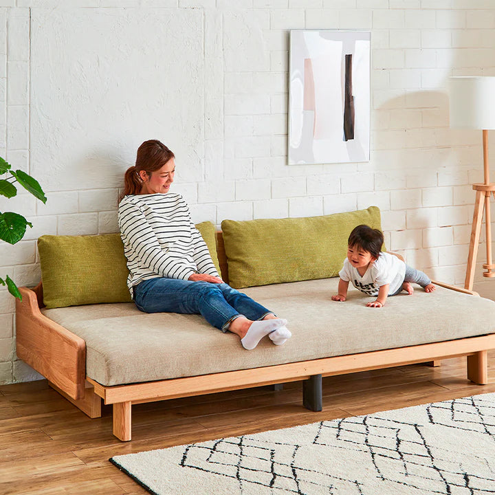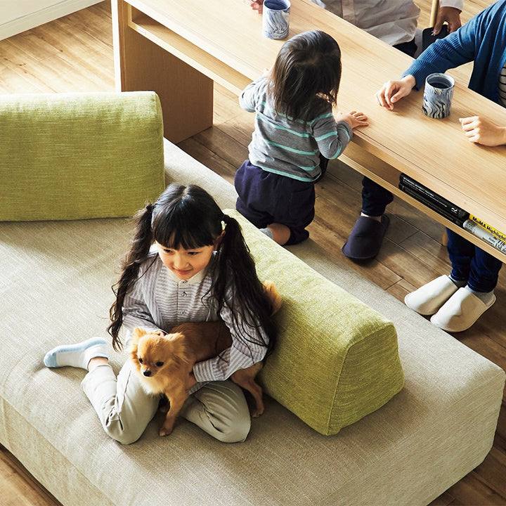 | 素材 | 本体:オーク無垢材・積層合板・プリント紙化粧繊維板・パーチクルボード 張地:ファブリック(ポリエステル100%) 本体クッション中材: ライトウェーブ(ポリエチレン100%)・高通気性無膜ウレタンフォーム 置きクッション中材:ポリエステル樹脂綿・ライトウェーブ(ポリエチレン100%) |
