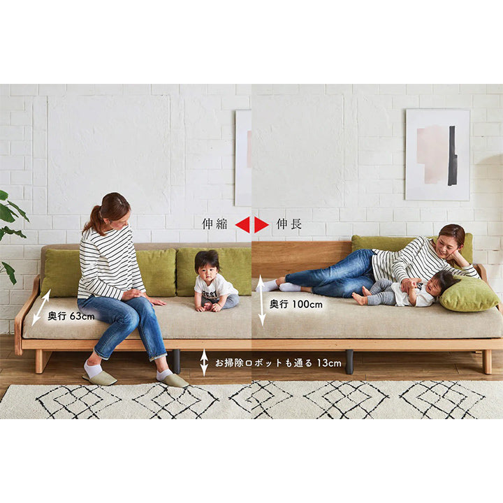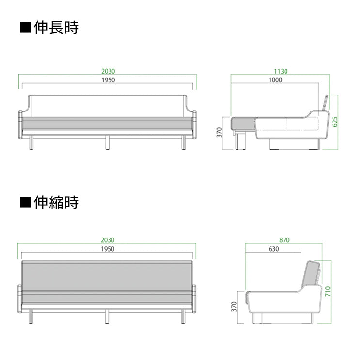 | サイズ | [伸長時] W(幅) 203cm × D(奥行) 113cm × H(高さ) 62.5cm SH(座面高) 37cm [伸縮時] W(幅) 203cm × D(奥行) 87cm × H(高さ) 71cm SH(座面高) 37cm |
