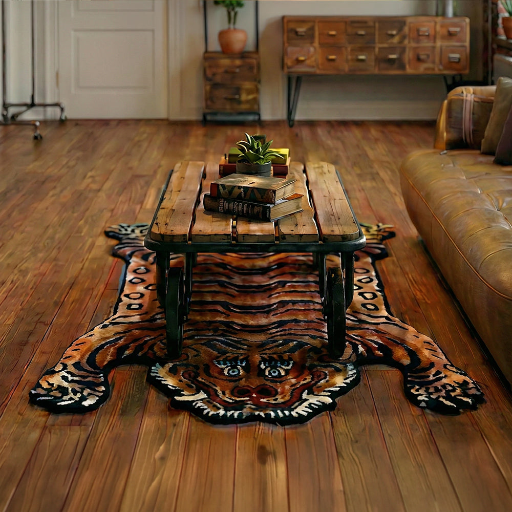 車輪がアクセントのセンターテーブルに虎柄のラグを添えて